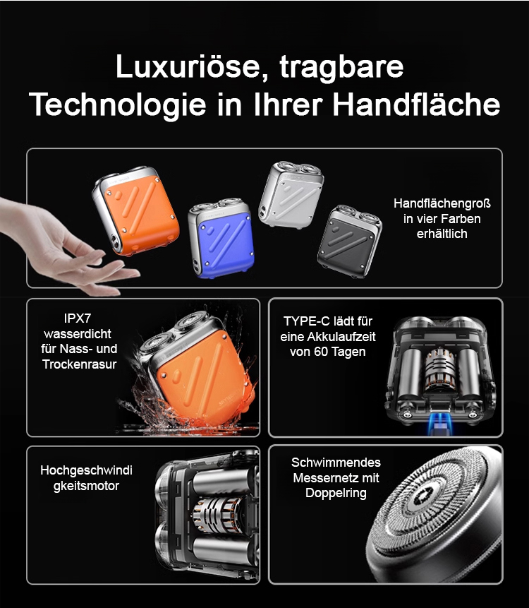 ⚡️ Schnell. Präzise. Einfach zu reinigen. 🌀 Zwei-Kopf-Design – erreicht jeden Winkel. 🔋 12 Minuten Ladezeit – bis zu 20 Stunden Laufzeit. 💧 Vollständig wasserdicht – für mühelose Handhabung.
